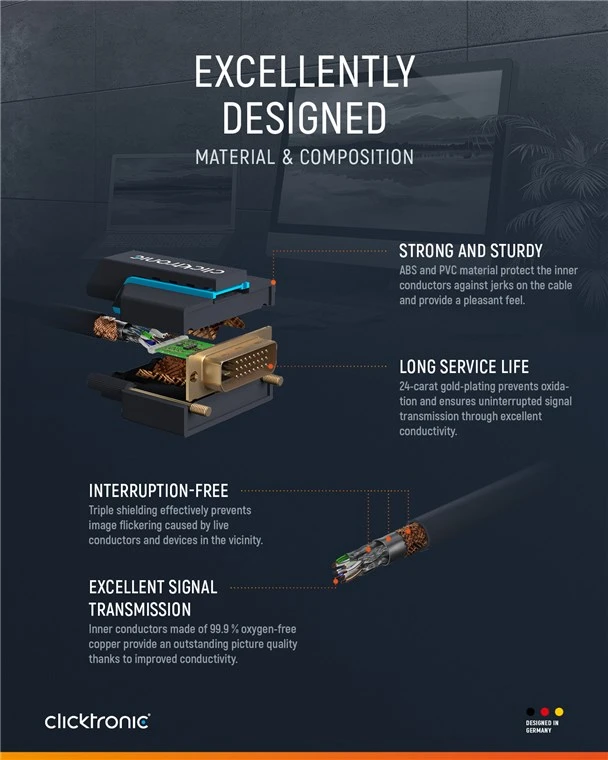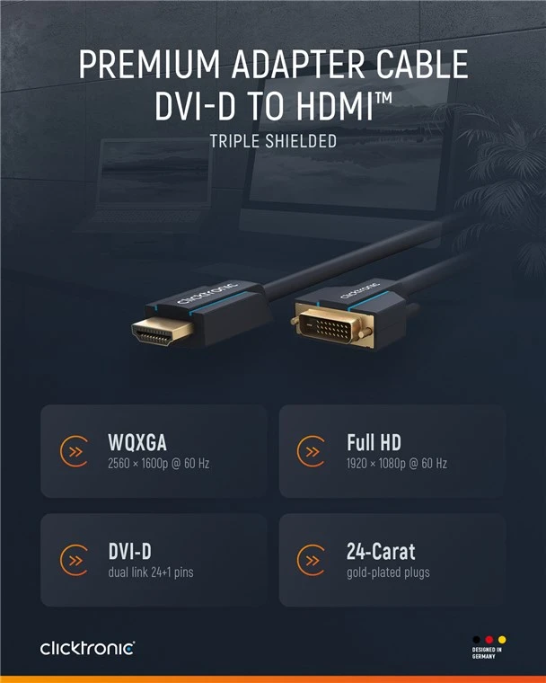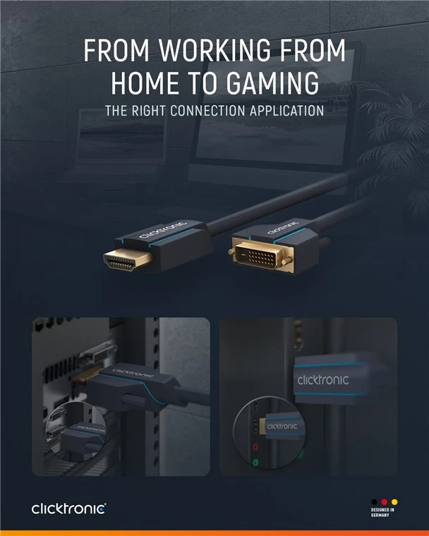 Clicktronic attaches great importance to durability and stability. Our quality promise: 10-year warranty on our HDMI™ cables. The proprietary construction of our connection cables makes them extremely robust. The three-part connector construction made of PVC and ABS components compensates for jerky pulling on the cable, making it ideally protected against cable breakage. High-quality, gold-plated contacts and pure copper conductors transmit digital signals in maximum quality. The screwable attachment on the DVI-D connector ensures a secure hold and optimal transmission even with moving monitors. The DVI-D-to-HDMI™ adapter cable enables a razor-sharp image and has a fast transmission speed.