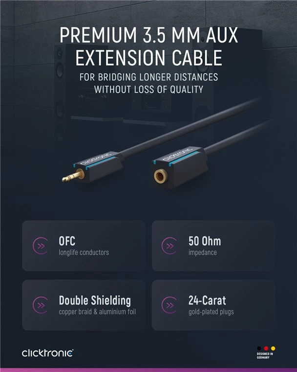 24-carat gold-plated, stainless steel AUX connectors for minimal transmission resistance and crystal-clear sound