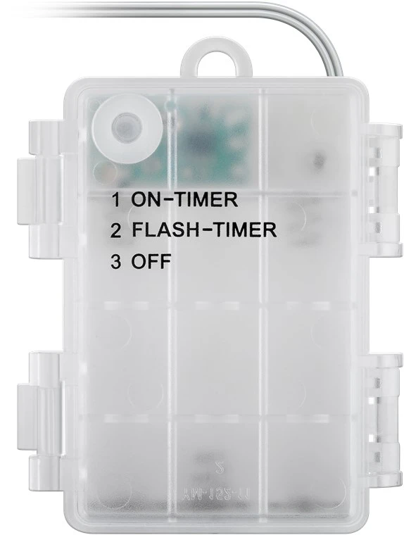 LED string light with timer function: 6 hrs. on/18 hrs. off, 3-position switch: steady light/timer, flashing/timer, off