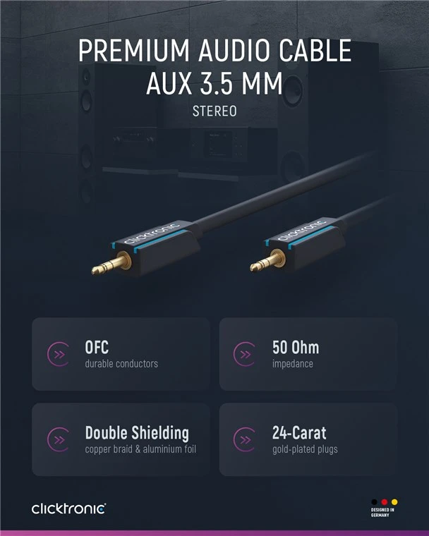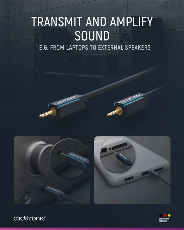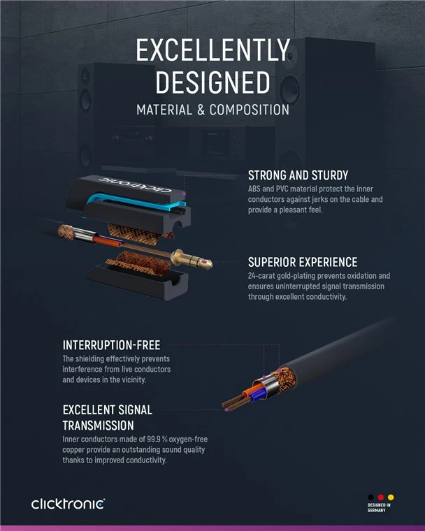 Clicktronic attaches great importance to durability and stability. Our quality promise: 10-year guarantee on our jack cables. The three-part connector construction made of PVC and ABS components compensates for jerky pulling on the cable, making it ideally protected against cable breaks. High-quality, gold-plated contacts and pure copper conductors transmit audio signals in maximum sound quality for a perfect sound experience. The brand's own robust construction of our audio cables thus ensures long-lasting home entertainment.