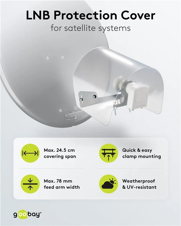 With a maximum cover width of 24.5 cm, the weather protection cover is suitable for multi-feed systems with up to 2x LNBs (maximum width of feed arms 7.8 cm)