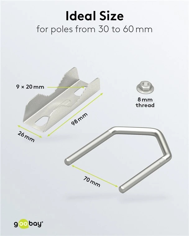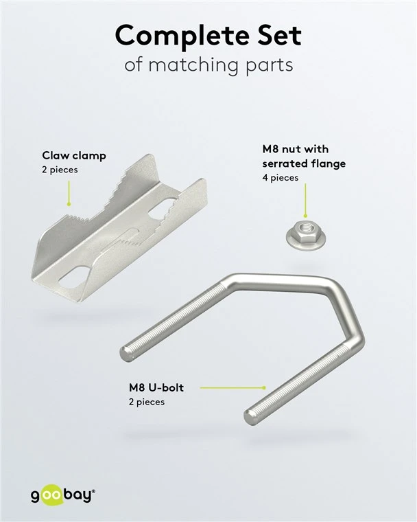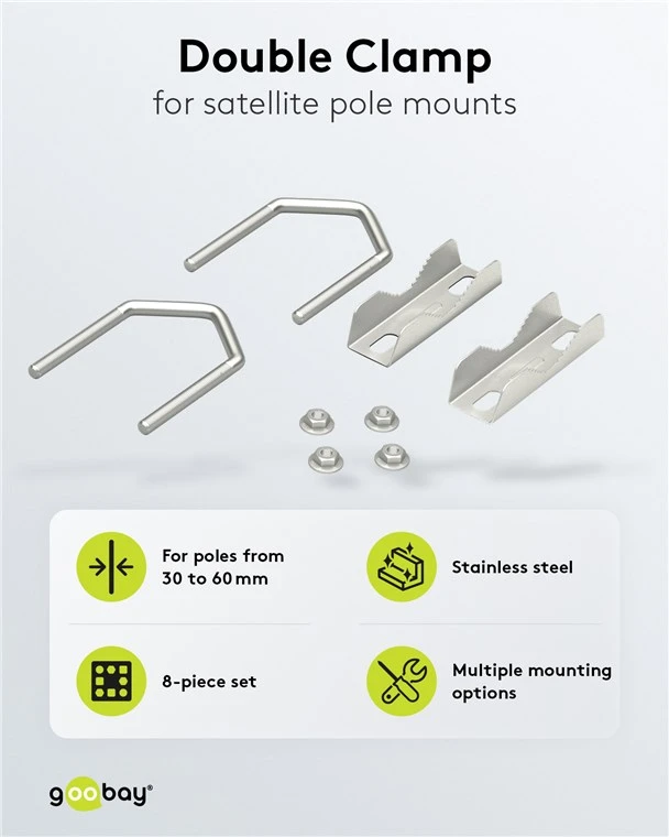Combined with a separately available wall mount (e.g. 67300, 67301, 67302), you can use the clamps to mount a satellite dish to railings and poles outdoors
