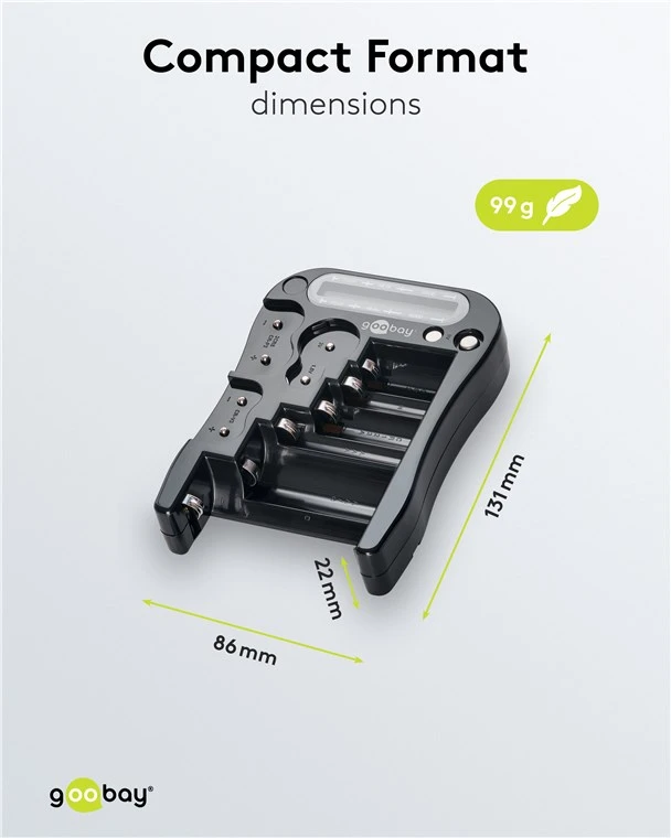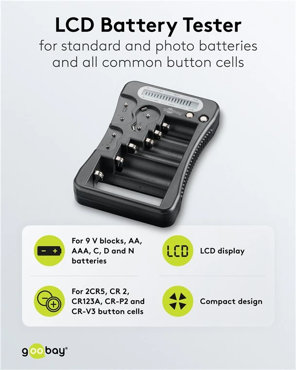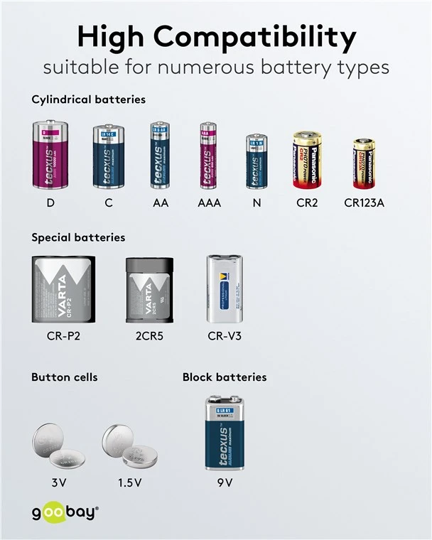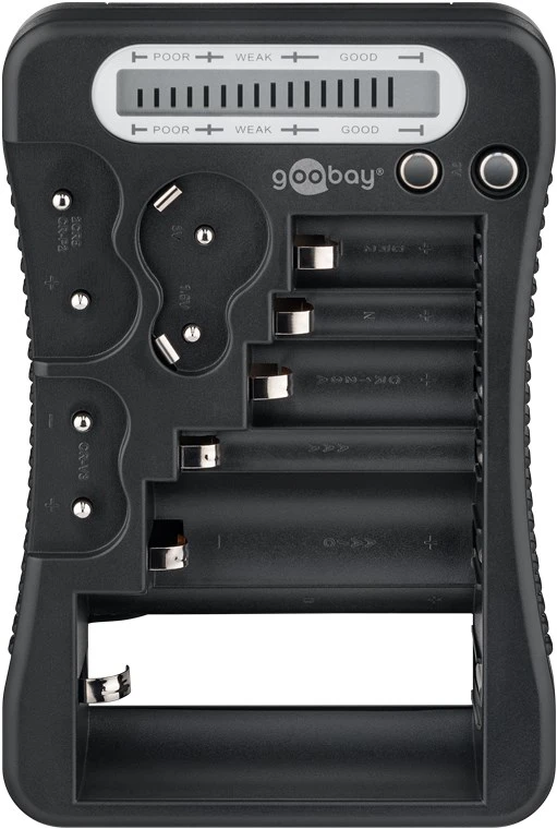 Easy-to-use Goobay battery tester to check the charge status of many common batteries and rechargeable batteries