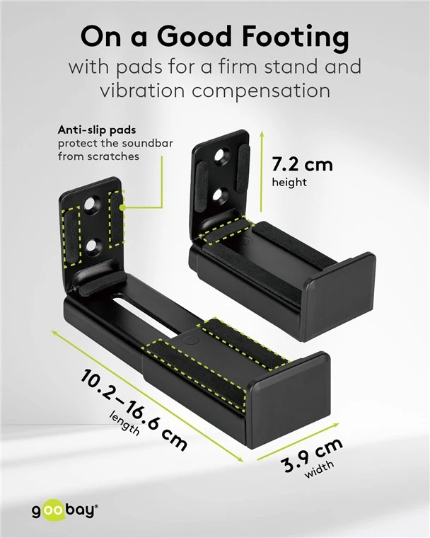 Variably adjustable mount for most common soundbars up to a depth of 90-154 mm, e.g. from Samsung, LG, Sonos, Sennheiser, Teufel or JBL