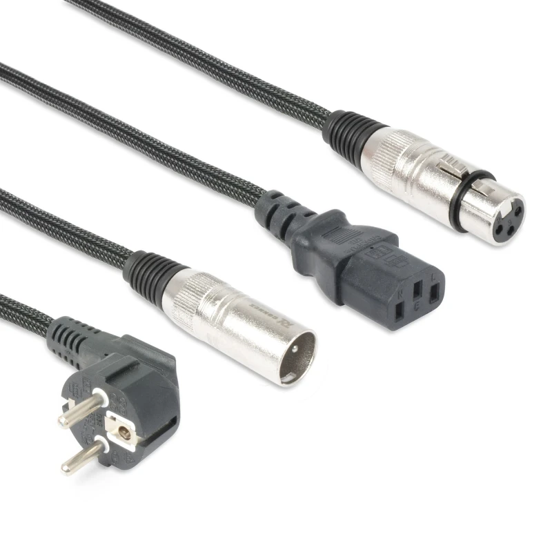 Питание и сигнал в одном кабеле. Эти кабели с разъемами Schuko и XLR на одном конце и IEC и XLR на другом, упрощают подключение LED-эффектов, вращающихся голов и настенных светильников.