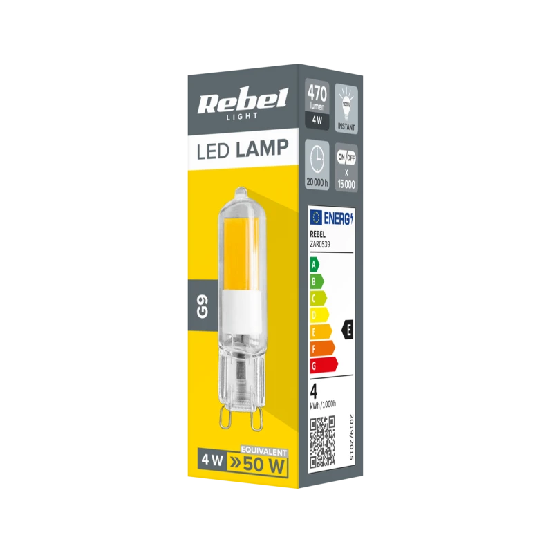 Rebel LED G9 4W, 4000K, 230V Лампа Светодиодная лампа Rebel с цоколем G9 – это энергоэффективный источник света с мощностью 4 Вт, идеально подходящий для использования в осветительных приборах, требующих компактных ламп. Она излучает нейтральный белый свет с цветовой температурой 4000K, обеспечивая приятное и равномерное освещение. Эффективное освещение Лампа генерирует световой поток 450 лм, что соответствует традиционной лампе накаливания мощностью 50 Вт, но со значительно более низким энергопотреблением. Угол рассеивания света 360° обеспечивает полное и равномерное освещение пространства, идеально подходящее для общего освещения в различных помещениях.