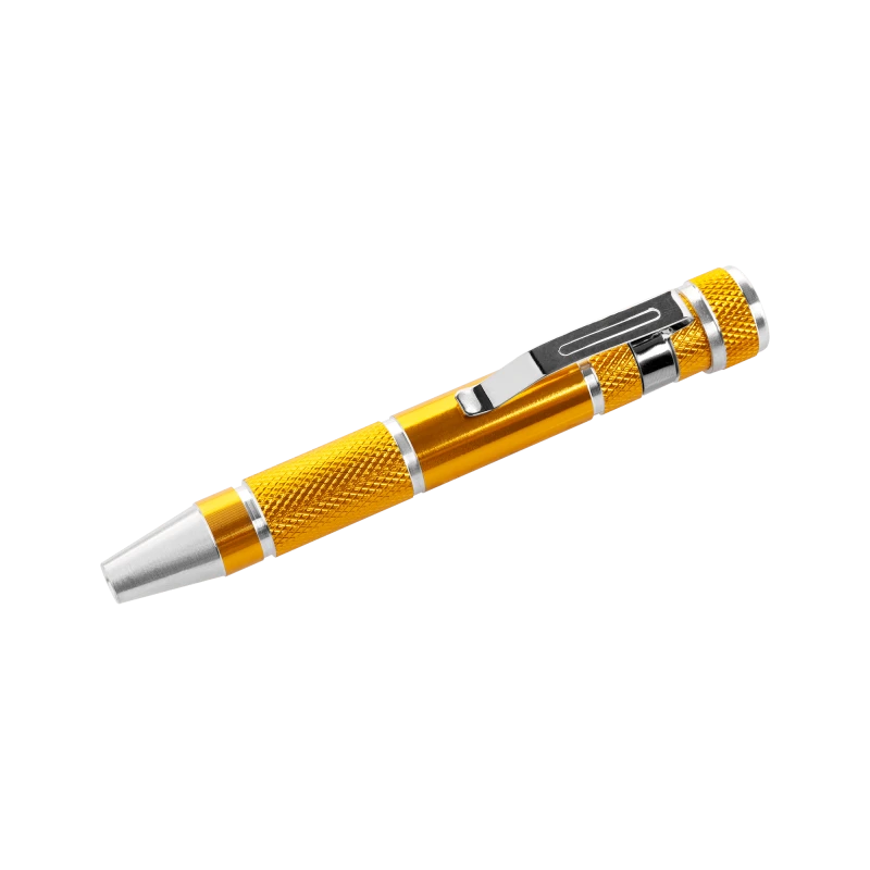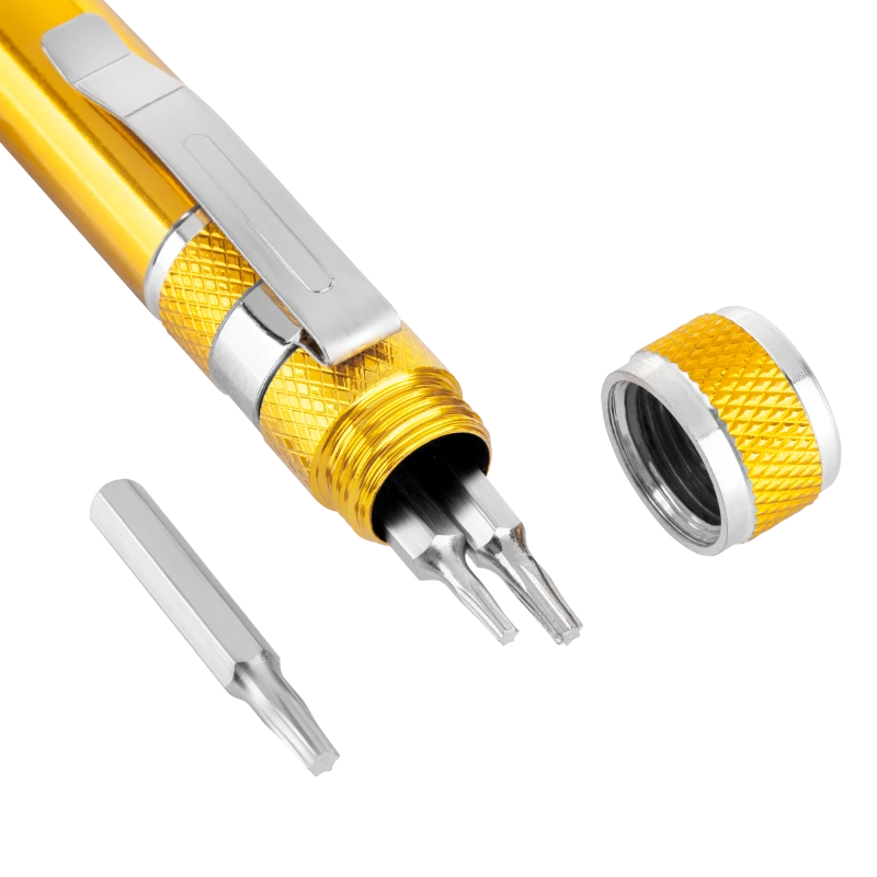 Прецизионная отвертка 9 бит Компактная прецизионная отвертка – полезный аксессуар не только для любителей мастерить своими руками. Она идеально подойдет, например, для замены батареек в электронных игрушках и других ремонтных работах. Ее небольшой размер позволяет легко спрятать ее в сумочке, а форма ручки с дополнительным зажимом позволяет прикрепить изделие к рубашке или карману брюк, чтобы она всегда была под рукой в любой ситуации. Магнитный набор Внутри изделия находится отсек для 9 бит из хром-ванадиевой стали: шлицевые, Phillips и Torx.