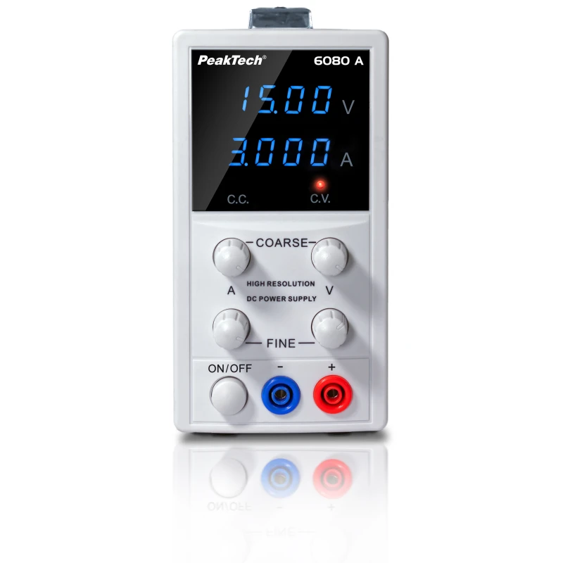 Новый **PeakTech 6080 A** — это **линейно регулируемый** лабораторный блок питания с **пассивным охлаждением** и цифровым дисплеем высокого разрешения (**1мА** и **10мВ**). Эта модель имеет грубую / точную регулировку с помощью отдельных потенциометров для точного выбора настроек тока и напряжения.