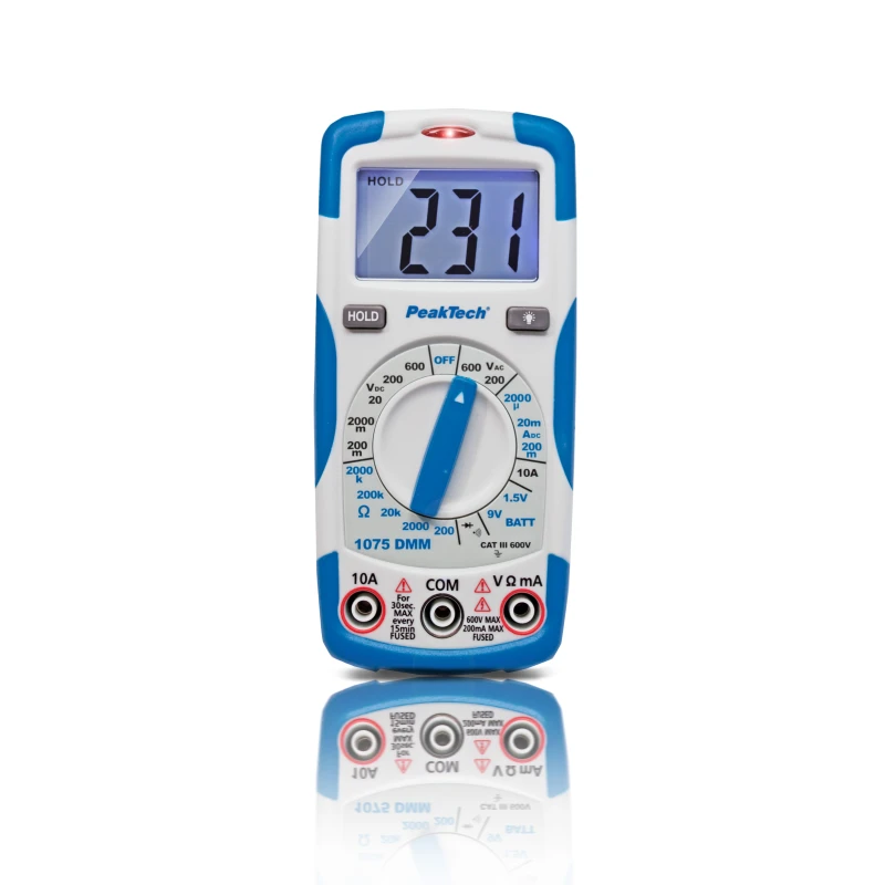 PeakTech 1075– это компактный ручной мультиметр с 3 1/2-разрядным ЖК-дисплеем, который легко читается благодаря большим сегментам и встроенной подсветке.