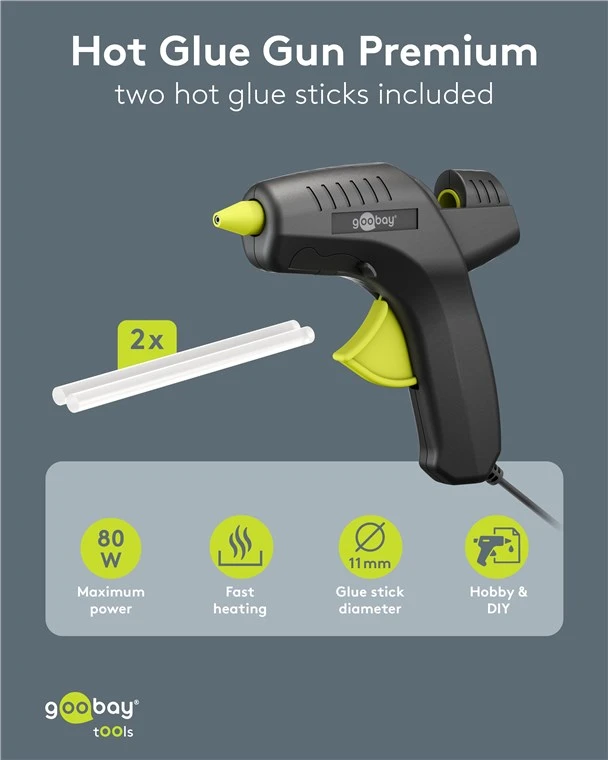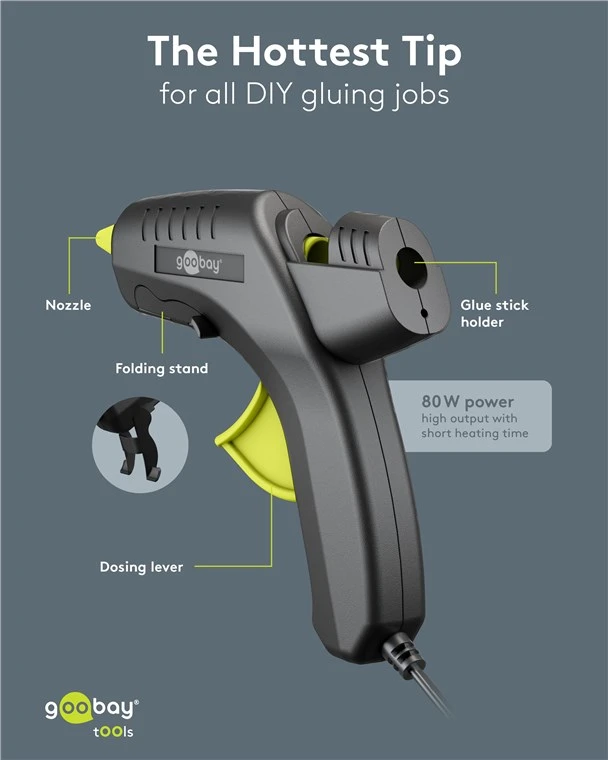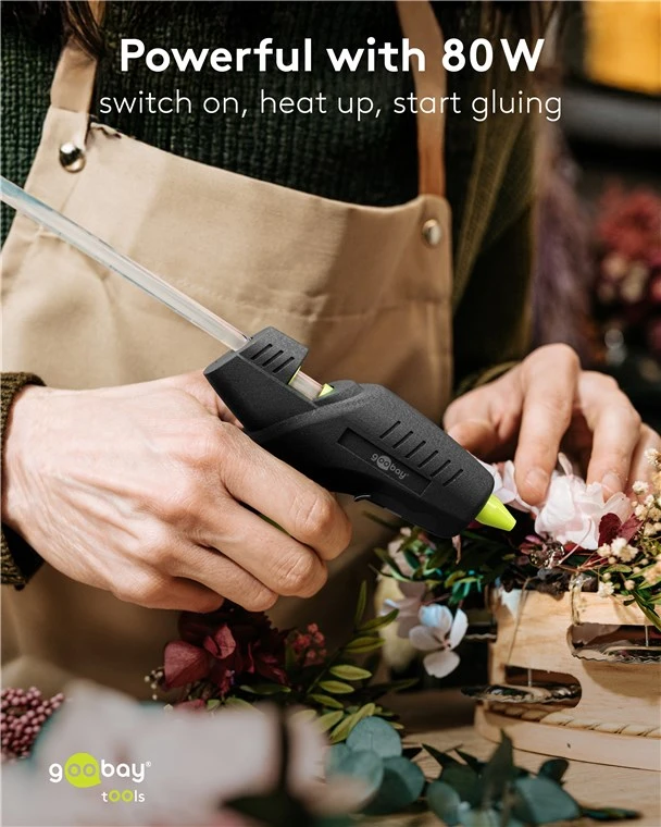 The powerful must-have for creative minds and DIY enthusiasts: Reaching operating temperature quickly at 80 W, the glue gun is a practical assistant for many decoration and DIY projects. From decorations and collages to ceramic repairs, the gun is the quick helper for all repair work around the house. Switch on, heat up, let's go.