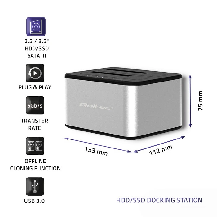 The presented model of Qoltec docking station has the function of creating copies of data between drives in offline mode by pressing the switch on the case. Cloning is done without being connected to a computer, and the progress and completion of the process is indicated by luminous diods lights.Do you value your time and data protection is important to you? The docking station has space for two disk HDD and SSD, also supports USB 3.0 up to 5Gbps 2.5" and 3.5" and the SATA I/II/III standard.
