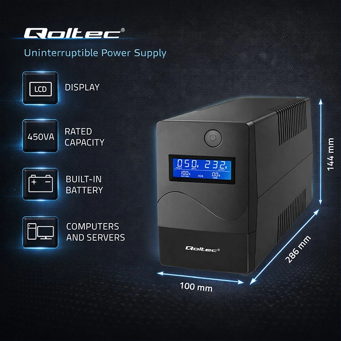 Each of us has often dealt with voltage drops at home or at work. Sometimes, their only consequence is the need to restart the computer. But how many times have you lost important data due to such an event, data that wasn’t saved on the disk, or encountered a device failure? If the above situations are familiar to you, we have a solution that will address problems caused by power outages or voltage drops. The UPS Qoltec 450VA 240W LCD USB RJ45 uninterruptible power supply is the solution that ensures a constant flow of energy necessary for the stable operation of your computer.