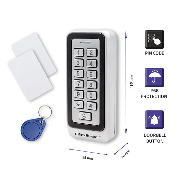 The presented model consists of an illuminated digital keypad, a doorbell and a reader for proximity cards and key tags.