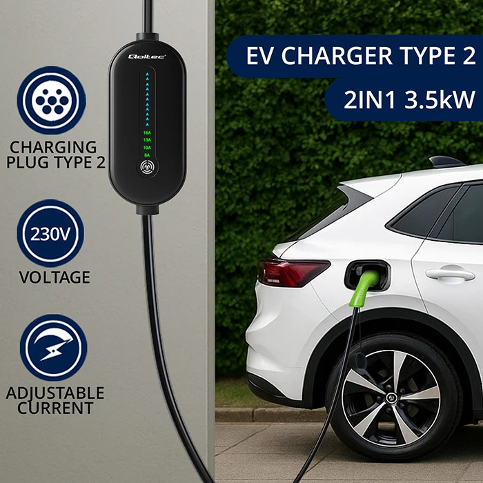 The Qoltec charger supports four current modes: 8A, 10A, 13A and 16A. It is worth noting that the Type 2 connector is designed for electric vehicles with a charging power greater than 3kW.