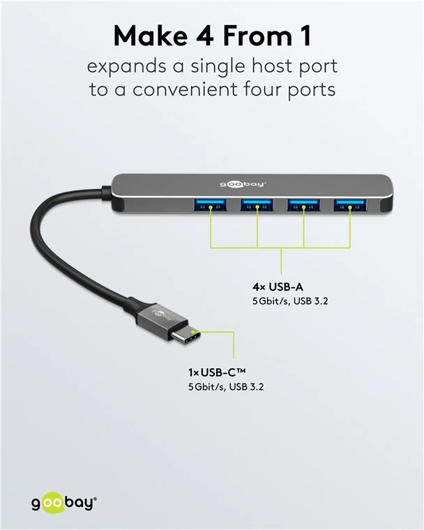 The slim hub multiplies the connection, suitable for all USB-A devices and simultaneously delivering SuperSpeed data rates via the USB 3.2 standard.
