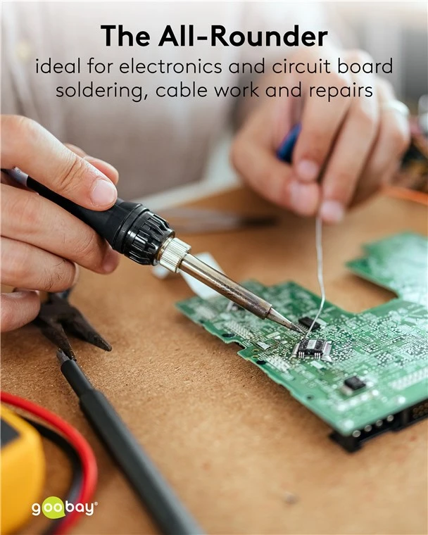 The soldering iron with 5 heat settings is perfect for small repairs and soft soldering at 100–500 °C (25–60 W) on circuit boards, household appliances and electronics