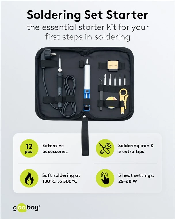 The all-rounder in your workshop and on the road: With its extensive range of accessories, the soldering iron is your resourceful assistent in all soldering projects, from cable work to electronics and circuit board soldering. Even as a beginner, this set provides you with a complete starter kit for your entry into the world of soldering.